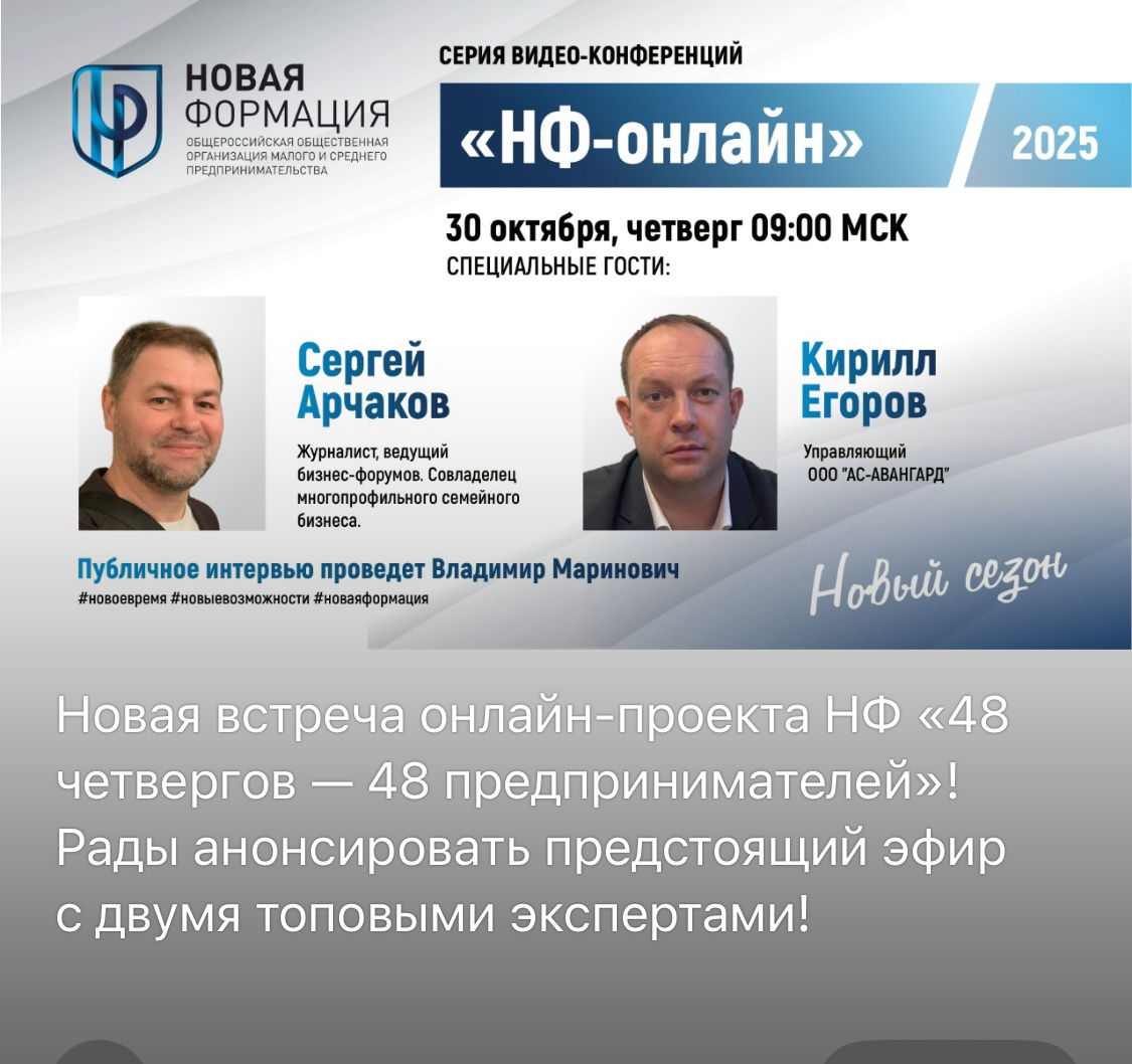 ❗️Анонс. Среда 30 октября 2025. 9 утра. Прямой 30-минутный эфир. Заходите! 🌟 Новая встреча онлайн-проекта НФ «48 четвергов — 48 предпринимателей»! Рады анонсировать предстоящий эфир с двумя топовыми экспертами! 30 октября| 09:00 (МСК) Онлайн-трансляция https://ocf2k10x.ktalk.ru/yv7frfi2xly2 Гости эфира: Сергей Арчаков Журналист, ведущий бизнес-форумов. Совладелец многопрофильного семейного бизнеса. Управляет 5 ключевыми направлениями вместе с супругой: 1. Сеть шахматных школ «Шахматория» (12 школ в Москве, турниры, городской лагерь). 2. Курсы китайского языка «Китайский диалог». 3. Франшиза развивающих центров Boom Kids. 4. Кинокомпания «Белый странник» (собственник и директор). 5. Главный проект — Семья Арчаковых. Воспитал двух детей-вундеркиндов, которые сами являются успешными проектами: • Сын Андрей — самый молодой кинорежиссер России, победитель десятков кинофестивалей. • Дочь Лада — знает три языка, профессиональный вокалист, победитель международных конкурсов. Пропа