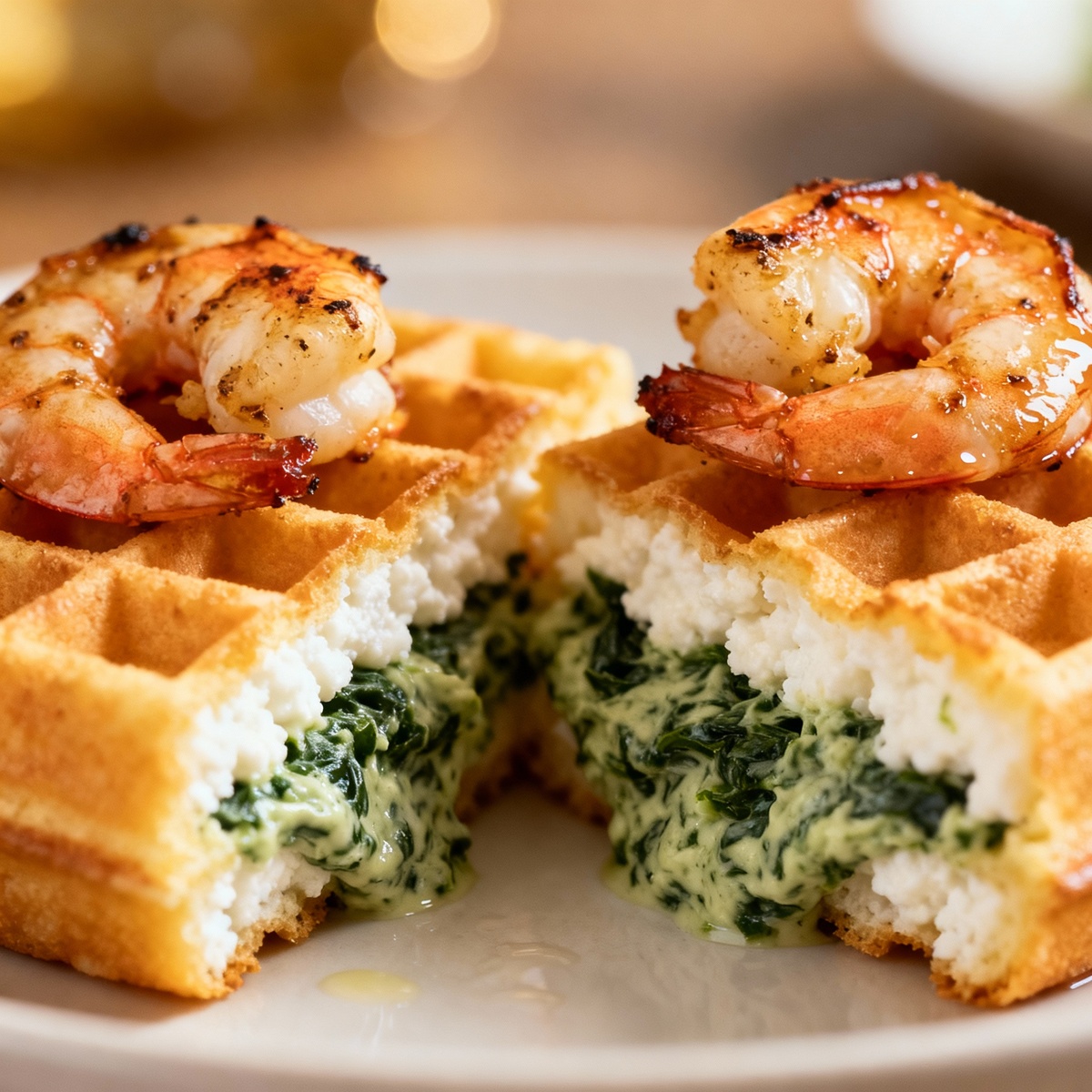 Всем привет! Сегодня мы начинаем большой и вкусный проект — подборку лучших рецептов вафель для здорового питания для электровафельницы. И начнем мы с творожных вафель со шпинатной начинкой и креветками. Творожные вафли со шпинатной начинкой и креветками — это идеальное сочетание нежного творожного теста, ароматной зелени и сочных морепродуктов. Это блюдо отлично подойдет для завтрака, легкого обеда или праздничного перекуса. Для теста: Для начинки: Шаг 1: Готовим тесто для вафель Смешайте в блендере творог, яйцо, рисовую муку, сухой чеснок и щепотку соли. Взбивайте до получения однородной массы. Шаг 2: Выпекаем вафли Разогрейте вафельницу и выложите в нее творожное тесто. Выпекайте вафли примерно 4 минуты до золотистой корочки. Шаг 3: Готовим шпинатную начинку Пока вафли готовятся, приготовьте начинку. Смешайте в блендере шпинат, кремчиз и щепотку соли до однородной консистенции. У вас получится нежный крем с насыщенным зеленым цветом. Шаг 4: Обжариваем креветки Обжарьте очищенные