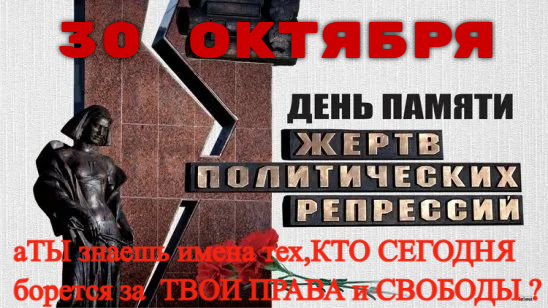 Сегодня, 30 октября, в нашей стране отмечается День памяти жертв политических репрессий. Мы будем говорить не о том прошедшем времени....Трагедия первой половины ХХ века коснулась судеб очень многих граждан страны, попавших в круг массовых арестов, выселений, расстрелов.На то есть доказательства...Есть и опровержения.... СЕГОДНЯ!!! МЫ - СВИДЕТЕЛИ РЕПРЕССИЙ И ЗАКЛЮЧЕНИЙ ТЕХ,КТО СПРАВЕДЛИВО УКАЗЫВАЕТ НА НЕДОЧЁТЫ ВЛАСТЬ ЗАДЕРЖАВЩИХСЯ....Власть имущих Сего Дня.. Решением Министерства просвещения День памяти жертв политических репрессий был удалён из Календаря образовательных событий на 2021/2022 год[18], и по состоянию на 2025 год, также в календаре образовательных событий не появляется. ЗАДУМАЙТЕСЬ - ДЛЯ ЧЕГО???((( И,увы,НЕУГОДНЫЕ СегоДняшней ВЛАСТИ ЗАКЛЮЧЕНЫ В ЗАСТЕНКИ И НАД НИМИ ИЗДЕВАЮТСЯ!! И ЭТО ХХI ВЕК!!????? ЗАДУМАЙТЕСЬ !!!! Памятной датой послужили события 30 октября 1974 года, когда политзаключенные мордовских и пермских лагер
