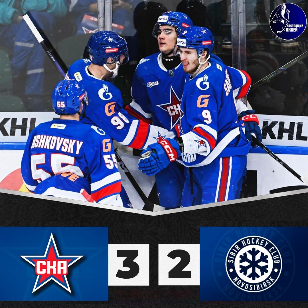 ⚡️⭐️ СКА одержал победу над «Сибирью», у новосибирцев пятое поражение подряд ⭐️ СКА – ❄️ Сибирь – 3:2 (1:0, 1:1, 1:1) ⭐️ 1:0 Короткий (Хайруллин, Мёрфи) – 04:55 (5x4) ❄️ 1:1 Ткачёв (Ахияров, Аланов) – 07:23 (5x5) ⭐️ 2:1 Савиков (Ларионов, Воробьёв) – 35:50 (5x5) ⭐️ 3:1 Плотников (Бландизи) – 40:28 (5x5) ❄️ 3:2 Чехович (Чуркин, Неколенко) – 58:48 (5x5) 🥅 Вратари: Иванов – Красоткин 📱 Подпишись на НАСТОЯЩИЙ ХОККЕЙ