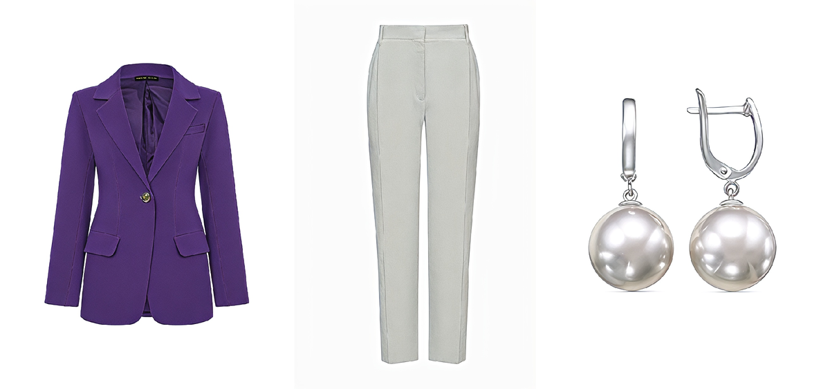 Как его носить? Проще всего начать с монохромного образа — фиолетовый жакет в паре с серыми брюками или юбкой. Добавьте жемчужные серьги, и получится элегантный комплект для любого случая. Если хочется большей смелости, попробуйте сочетание фиолетового с бежевым — такая комбинация выглядит современно и при этом сдержанно.