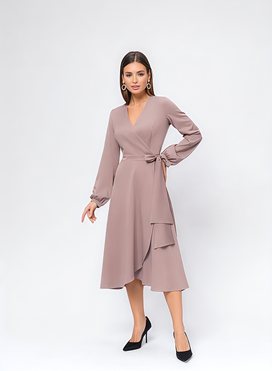 Перекрещивающиеся полотнища создают вертикальную линию от выреза до низа — силуэт вытягивается зрительно. Пояс можно затянуть посильнее или ослабить. Выраженная талия? Подчёркиваем. Талия незаметна? Создаём визуально.