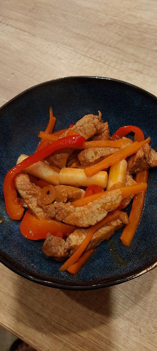 Если б этот текст составлял ИИ... ТОКПОККИ это не просто рисовые клецки это чики пики 😈 Открытием этого года для меня стали Токпокки. Их можно сочетать с разными начинками, мясо, сыры, морепродукты. Это необычное и сытное блюдо. Токпокки со свининой и овощами готовится быстро и не сложно. 🤙Прижариваем свинину до полуготовности 🤙Закидываем Лук и морковку бланшеруем на большом и сильном огне. 🤙Добавляем туда же перец болгарский, бланшеруем все так же на большом огне минуты 2-3 🤙Специи по вкусу, паста кочуджан смешать с тереяки чтоб не очень остро было, все смешиваем, добавляем воды 50-100мл, Соевый соус, чеснок 🤙Токпокки закидываем и все протушиваем до готовности токпокки. Токпокки становятся мягкими, значит готово.🤓 #токпокки #корейскаяеда #горловка #дзенеда #еда #хаски #фудфотография #едакакискусство #хаскивкадре #фудкультура #едаинстаграм Если интересно, первые нефотографибельные токпокки которые приготовила могу выложить в комментариях.