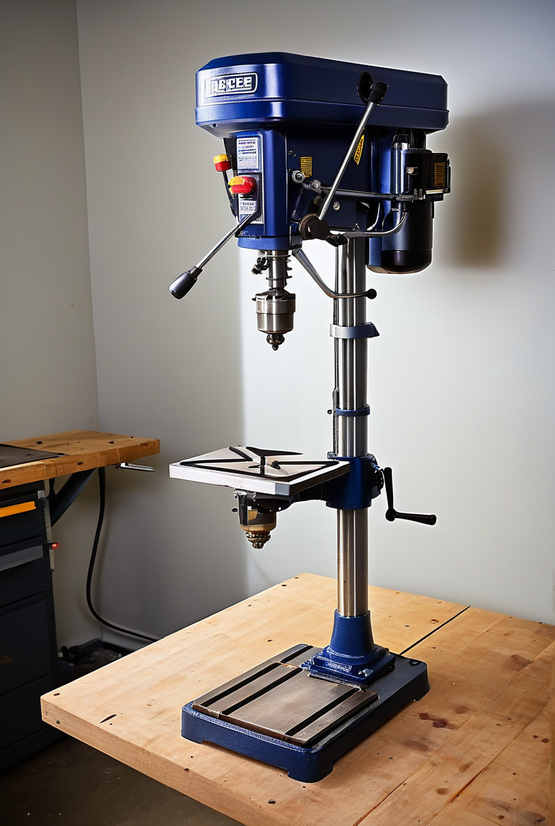 - Бытовой настольный станок: Идеальное оборудование для гаража или домашней мастерской. Цена делает его доступным для хобби. Ищите модели на 220В с мощностью двигателя 500-750 Вт и тяжелой чугунной станиной. Для работы по дереву и эпизодического сверления металла его характеристики (ход шпинделя 50-80 мм, патрон под максимальный диаметр сверла до 16 мм) будут оптимальны. Регулировка оборотов — ременная передача.
