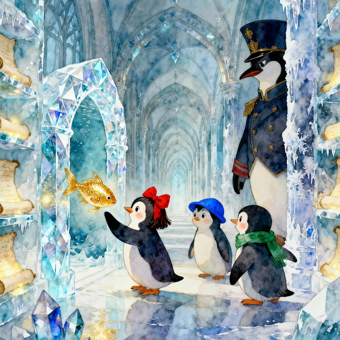 Первая встреча с дежурным произошла неожиданно. Аня, пытаясь проскользнуть в боковой коридор, не рассчитала скорость и врезалась в ледяную статую. Грохот привлёк внимание важного пингвина в строгой фуражке. Прорычал: «Нарушители!» — ускорив шаг. Дети едва успели юркнуть в узкий проход между ледяными стеллажами, заваленными старинными свитками.