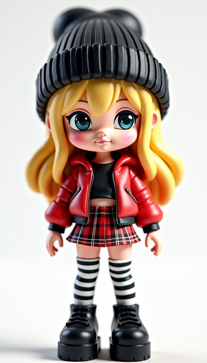 masterpiece, 8k, best quality, a stylish artistic blind box toy of a cool and cute girl, full body shot, made of high-transparency crystal clear resin, hyper-detailed, C4D style, 3D render, isolated on a pure white background. The girl has a bright, mischievous expression, her blonde hair is covered by a baggy black knit hat. She is dressed in an oversized neon green hoodie with ripped denim shorts and chunky sneakers. Streetwear fashion, trendy, collectible designer toy, unity and consistency in style.