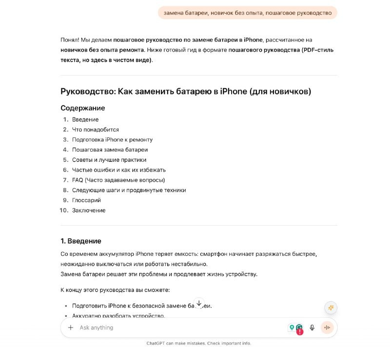 Осваиваем новые навыки с ChatGPT: мы нашли способ создать пошаговые инструкции для решения самых различных задач — от приготовления блюд до замены батареи iPhone. Чтобы начать, бот первым делом уточнит ваш уровень подготовленности и необходимый формат. В результате вы получите обширное руководство, которое включает разбор распространённых ошибок, раздел с часто задаваемыми вопросами и даже мини-словарь. Постмейкер - автоматическое ведение канала 🤖 Анимация | СhatGPT-4 | Помощь с резюме