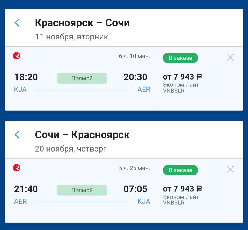 Ноябрьские скидки у "Аэрофлота" на Сочи. При покупке ↔️ выдаётся такое! 👆 Даты не все, но есть. Ищите. От 15800₽ ↔️ без багажа https://aviasales.tpm.lv/LVwBi71F #AER @KJA