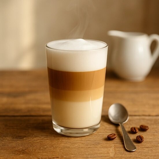 Название latte macchiato переводится с итальянского как «молоко, помеченное кофе». Это почти противоположность эспрессо макиато, где кофе “помечается” молоком. В латте макиато всё наоборот: основа — горячее молоко, а кофе добавляют сверху, чтобы создать красивое, мягкое трёхслойное сочетание. Этот напиток появился в Италии как способ приготовить кофе для тех, кто любит молочные напитки, но не хочет терять аромат эспрессо. С тех пор латте макиато стал одним из самых популярных видов кофе в Европе — особенно утренним напитком, который создаёт ощущение уюта и спокойного начала дня. Чтобы приготовить латте макиато, не обязательно быть бариста — достаточно немного терпения и понимания логики слоёв. Что нужно: Пошаговый способ: Совет: если хотите более сладкий вариант, добавьте немного сиропа — карамельного, ванильного или орехового — прямо в молоко до взбивания. Латте макиато — это самый нежный и визуально красивый кофейный напиток. Его вкус мягкий, сливочный, с деликатным кофейным послевк
