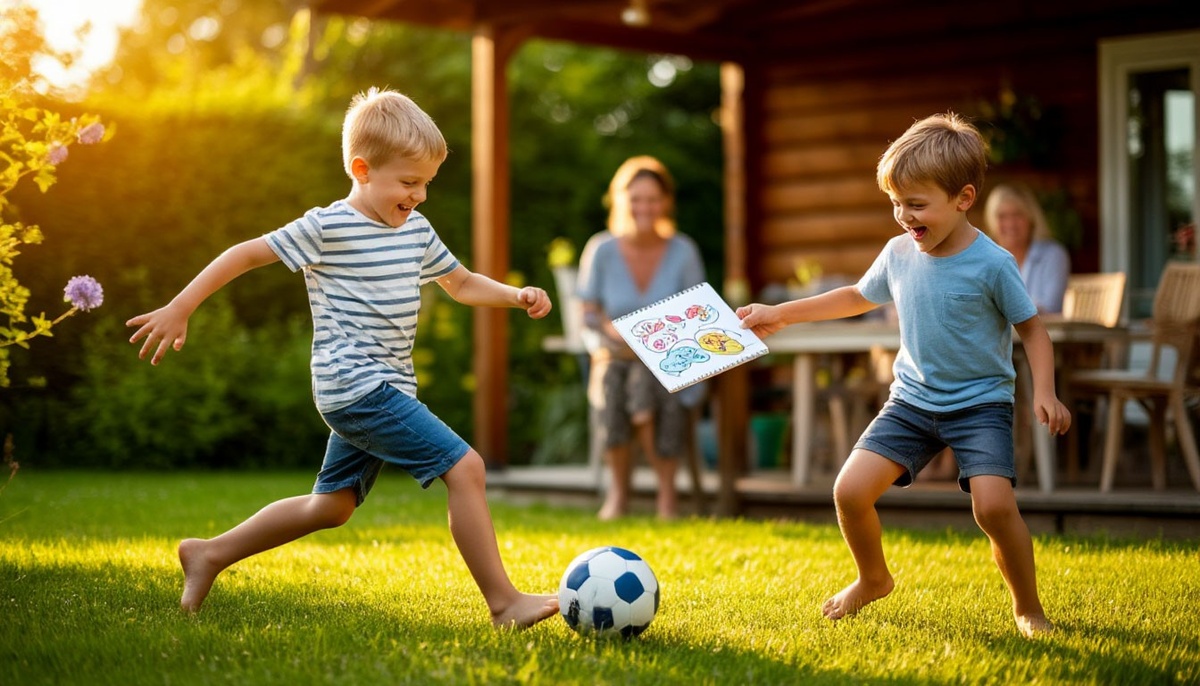 В огороде Максим гонял мяч между грядками, а Артём сидел на скамейке под яблоней, рисуя что-то в блокноте.