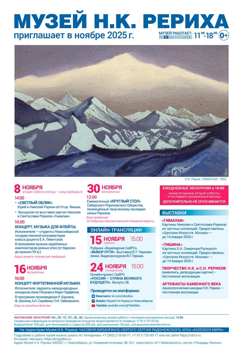 Музей работает с 11:00 до 18:00 (выходной — вторник). Стоимость билета 400 руб. Для пенсионеров и студентов 200 руб., для школьников 100 руб., для дошкольников бесплатно. ЕЖЕДНЕВНЫЕ ЭКСКУРСИИ (кроме вторника и последнего воскресенья месяца) в 14:00. Дополнительно не оплачиваются. +7(383)218-06-71 +7-913-720-00-77 По вопросам проведения экскурсий: +7-913-727-00-05 ВЫСТАВКИ: ● «Гималаи». Картины Николая и Святослава Рерихов из частных коллекций. Предоставлены «Центром Искусств. Москва» — до 14 января 2026 г. ● «Тишина». Картины Б.А. Смирнова-Русецкого из частных коллекций. Предоставлены «Центром Искусств. Москва» — до 14 января 2026 г. ● Творчество Н.К. и С.Н. Рерихов (живопись, репродукции картин) — постоянная экспозиция. ● Артефакты каменного века. Археологические находки Н.К. Рериха — постоянная экспозиция. МЕРОПРИЯТИЯ: 8 ноября суббота) 2-я суббота месяца — день свободного посещения музея. 14:00 «Светлый Облик»: Юрий и Николай Рерихи об Отце. Фильм. Экскурсия по выставке картин Нико