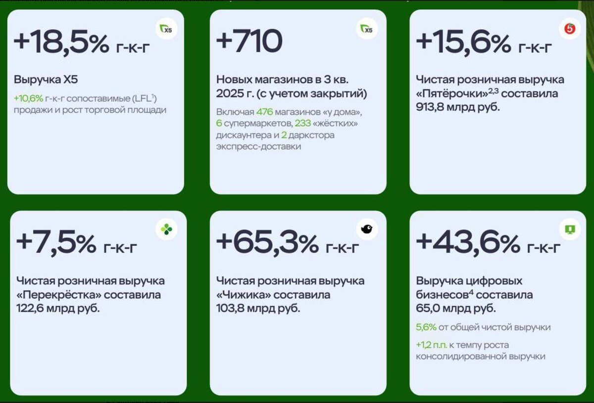 🔈 X5 Retail Group подвела итоги III квартала 2025 года ▪️ X5 — это ТОП-1 ритейлер в России, которого считаем самым желанным арендатором для создания готового арендного бизнеса (ГАБ). ▪️ По итогам III квартала: 👉 Выручка X5 выросла на 18,5% (LFL-продажи +10,6%) 👉 Открыто 710 новых магазинов за квартал (с учётом закрытий), из них 233 — дискаунтеры «Жёстко» 👉 Чистая розничная выручка «Пятёрочки» — 913,8 млрд руб. (+15,6%) 👉 Чистая розничная выручка «Перекрёстка» — 122,6 млрд руб. (+7,5%) 👉 «Чижик» растёт рекордно быстро! Чистая розничная выручка — 103,8 млрд руб. (+65,3%) 👉 Цифровые бизнесы X5 — 65 млрд руб. (+43,6% к прошлому году) ▪️Открытость компании, агрессивное развитие, гибкость форматов и лидирующие показатели делают X5 Retail Group одним из самых надёжных и перспективных арендаторов для коммерческой недвижимости. Смотрим на факты, следим за трендами и строим бизнес вместе с лидерами рынка!