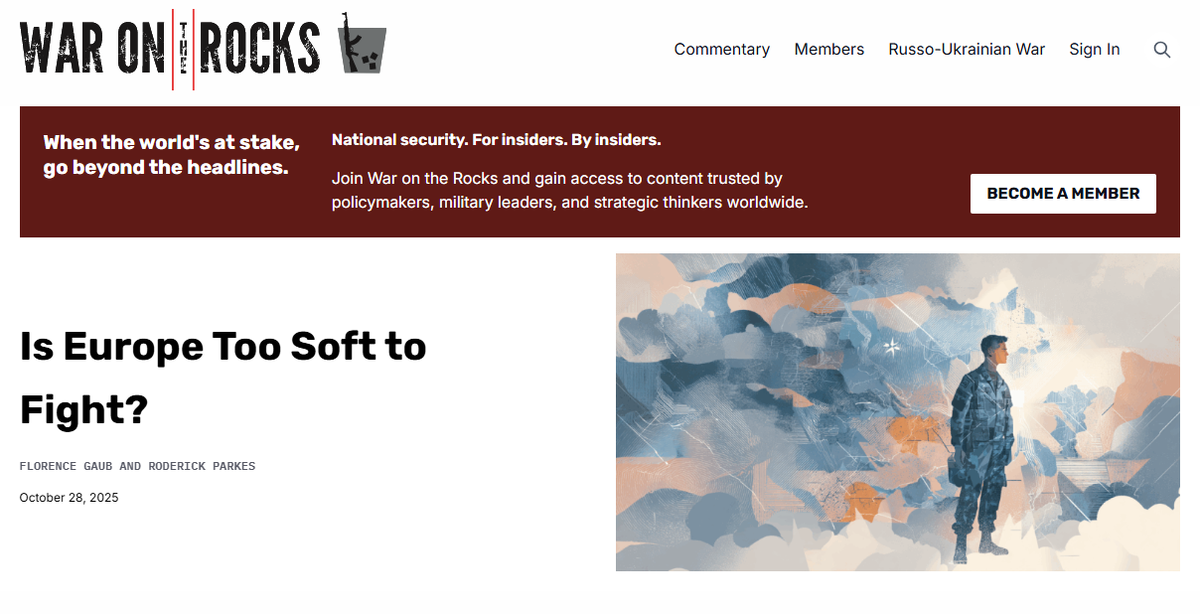 Европа обсуждает не войну, а психологию Пока где-то строят танки и дроны, в Европе задумались о куда более тонком вопросе — готово ли общество вообще защищаться? Не в смысле бюджета, а внутренне. Флоренс Гауб и Родерик Паркс из Колледжа обороны НАТО написали статью с выразительным заголовком: «Is Europe too soft to fight?» — «Слишком ли мягкая Европа, чтобы сражаться?». Убеждение, что европейцы слишком мягкие, чтобы сражаться — слишком изнеженные, слишком индивидуалистичные, слишком «постгероические», — незаметно формирует политические решения о мобилизации, наборе и расходах. Ветераны вооруженных сил, ученые и, возможно, даже европейские лидеры, похоже, больше обеспокоены расколом в своих собственных обществах, чем самим противником. И даже там, где уверенность в себе растёт — в Финляндии или Польше — она часто смягчается сомнениями по поводу важнейшего вопроса: защитят ли их другие союзники в случае нападения... С первого абзаца авторы признают: проблема не в трусости, а в настрое