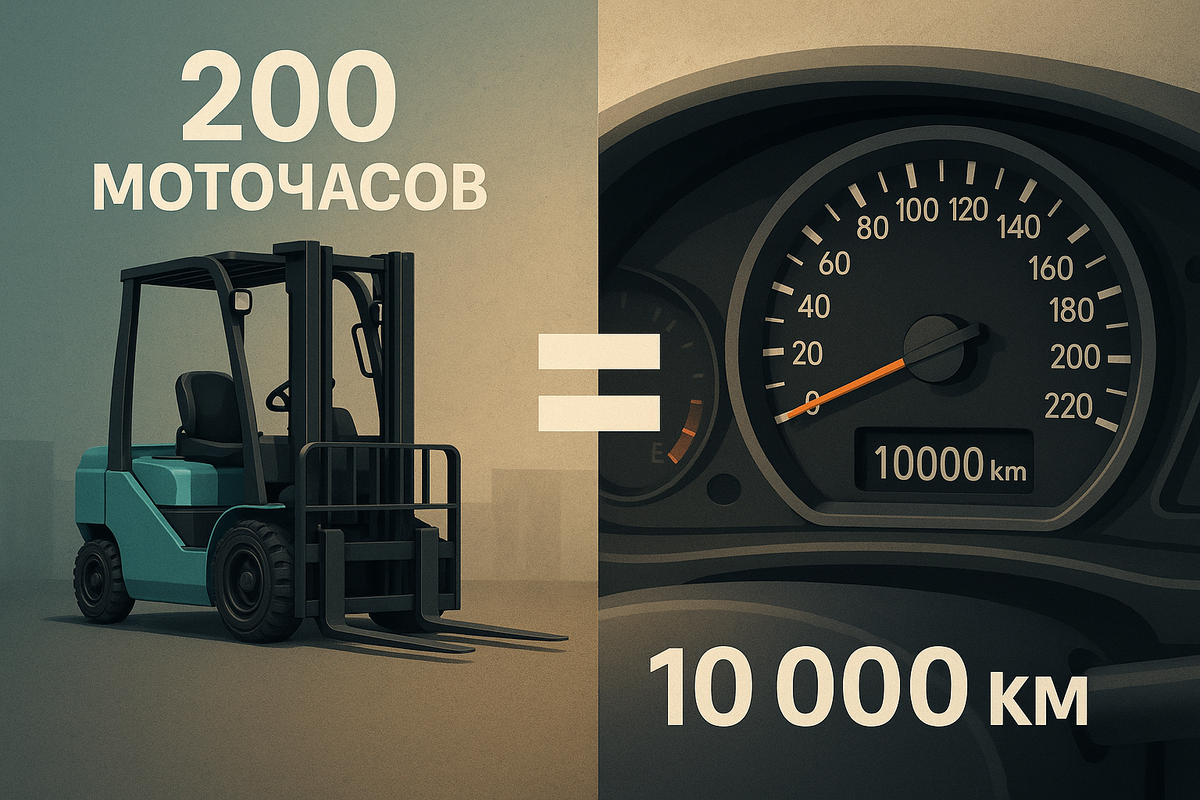 Большинство производителей сходятся во мнении, что 1 моточас погрузчика ≈ 50 км пробега автомобиля при средней скорости 50 км/ч и городском цикле.