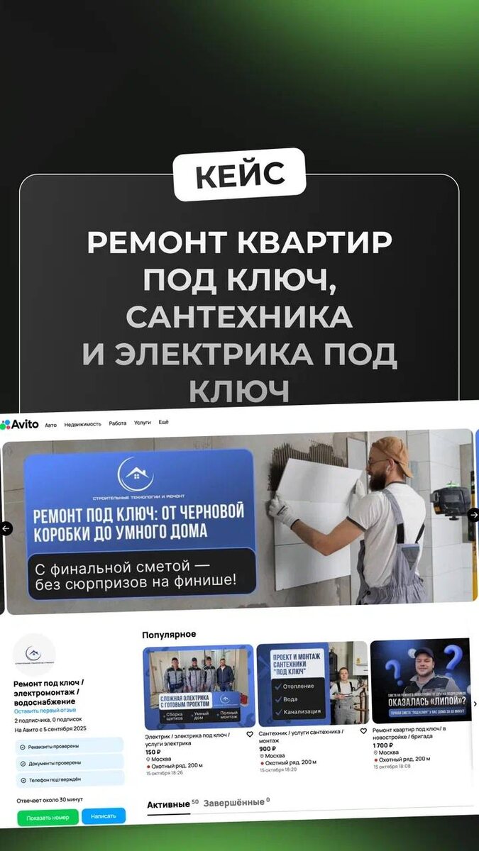 Кейс: ремонт квартир под ключ Доброе утро, коллеги. Делюсь долгожданным кейсом👇 Компания: Строительные технологии и ремонт Ниша: Ремонт квартир (новостройки и вторичное жилье, дома, коттеджи), прокладка электрики всего объекта, сантехнические работы под ключ. География: Москва, некоторые города МО с большим количеством новостроек В первый месяц работы перед нами стояли следующие задачи: • создать новый аккаунт и пройти верификацию по ИНН • подключить и оформить профессиональный профиль • получить 100 000р бонусов от Авито🤑 • провести аналитику спроса / предложения • подготовить продающие заголовки, и тексты • отрисовать инфографику и баннеры • сформировать стратегию продвижения • публиковать и продвигать объявления Основные ключевые слова Ремонт квартир, частичный ремонт, частичный ремонт квартир, ремонт в новостройке, ремонтная бригада, сантехнические работы, сантехник, монтаж, монтаж сантехники, услуги сантехника, электрик, электромонтаж, электрика под ключ, услуги электрика.
