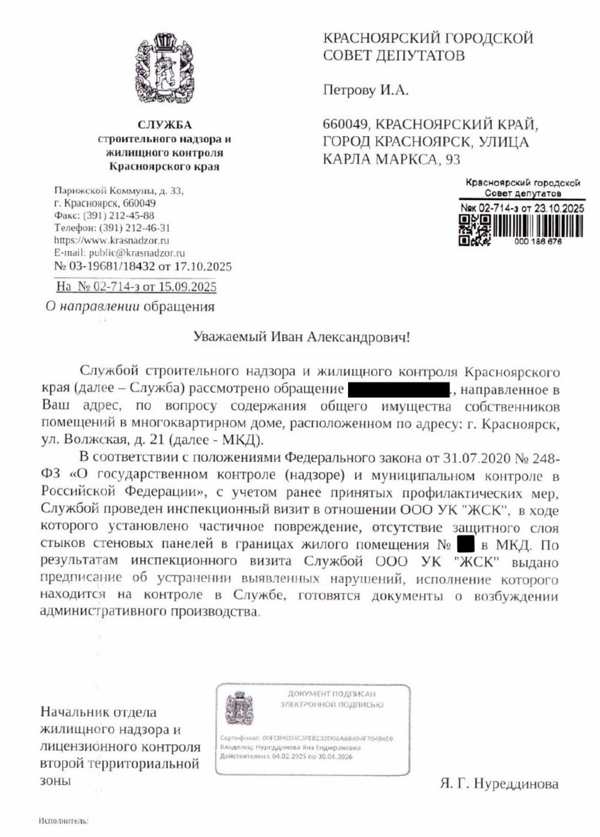 💬 Недавно я обратился в службу строительного надзора и жилищного контроля Красноярского края по поводу состояния общего имущества в доме по адресу: ул. Волжская, 21.