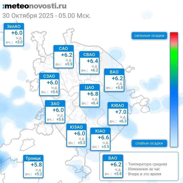В 5:00 в Москве было от +5.1°C до +7.1°C, средняя температура +6.3°C #погода #Москва #осень #температура #30октября #четверг
