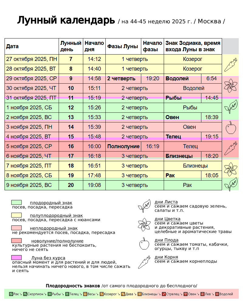 Благоприято: замачивание семян; посев, посадка на долгое хранение и на семена, также пересадка овощных растений, особенно картофеля, корнеплодных и луковых (на убывающей Луне); также деревьев и кустарников, бобовых (на растущей Луне), зерновых; посадка подвоев для дальнейшей перепрививки; можно пересаживать растения с ослабленной корневой системой; подкормка растений (корневая и некорневая); обрезка (улучшается заживление, лучше в новолуние, 3 и 4 четверти), прищипка, прививка и заготовка черенков (на растущей Луне); обработка от болезней и вредителей.