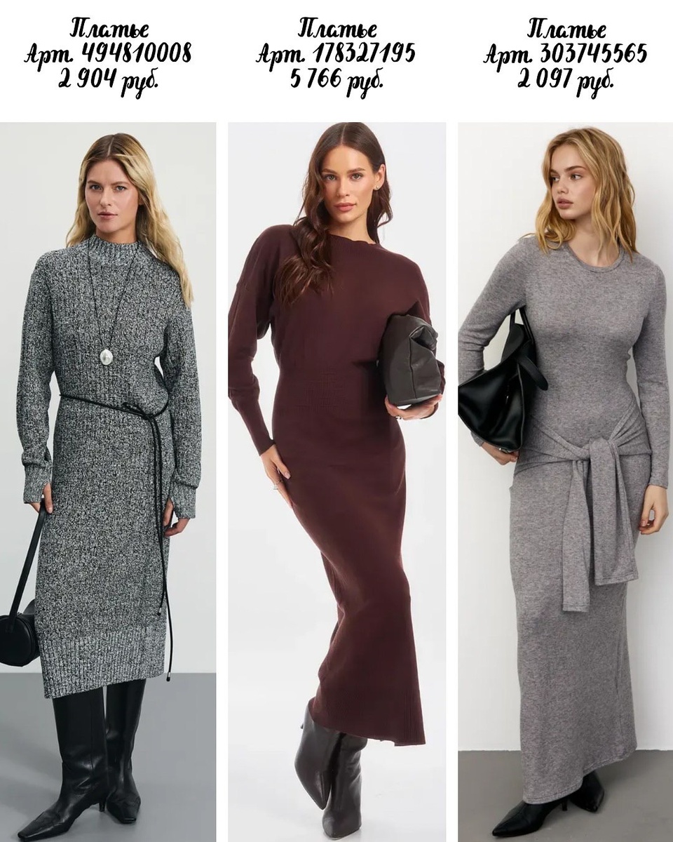Мягкая фактура, чистые линии и выверенные пропорции — вязаное платье умеет быть и уютным, и собранным. Я разобрала девять моделей строго по порядку, как на фото, чтобы вы быстро нашли свою. У каждой позиции — детальное описание и мой совет стилиста. Меланжевый серый с выразительной фактурой «соль-перец». Полотно средней плотности, не просвечивает и держит форму. Высокая мягкая горловина, длинный рукав с узкой манжетой. Длина миди закрывает голень, широкий нижний подгиб добавляет веса к низу, за счёт чего силуэт смотрится устойчиво. Тонкий ремешок-шнур формирует талию, но при желании его можно убрать для прямой посадки. Совет стилиста: сочетайте с высокими чёрными сапогами-трубами и сумкой на длинном ремне. В прохладу — пальто-халат графитового оттенка и длинная подвеска для вертикали. Густой какао-бордовый цвет, гладкая вязка и выверенная приталенная форма. Акцент на линии плеча — посадка плотная, но не стесняет. Юбка идёт столбом к щиколотке, визуально вытягивая рост. Горловина без в