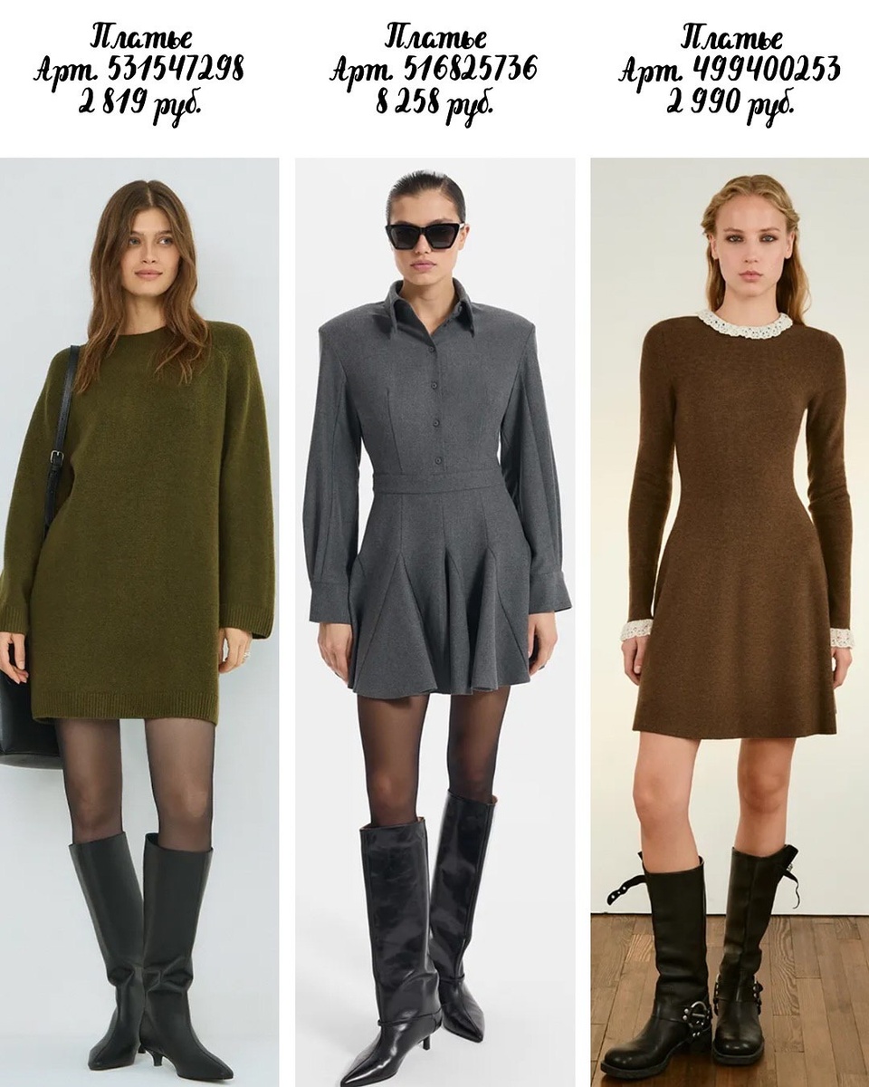 - Выходной с характером: платье № 2 или № 6 + высокие сапоги + структурная сумка.