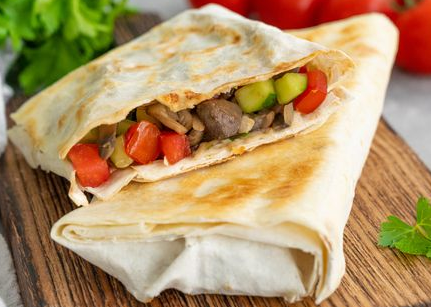 Ингредиенты: - 1 лаваш - 3-4 помидора - 2 луковицы - 2-3 огурца - 140 г ветчины - 100 г грибов (шампиньоны) - 100 г сыра - 100 г майонеза - зелень Приготовление: Грибы промыть, отварить до готовности, остудить. Помидоры и огурцы вымыть, репчатый лук очистить. Сыр натереть на мелкой терке. Измельчить помидоры, репчатый лук, ветчину, огурцы и грибы. Поместить их на лаваш, смазанный майонезом. Свернуть лаваш конвертом, посыпать сыром и запечь в духовке или микроволновой печи. Украсить зеленью.