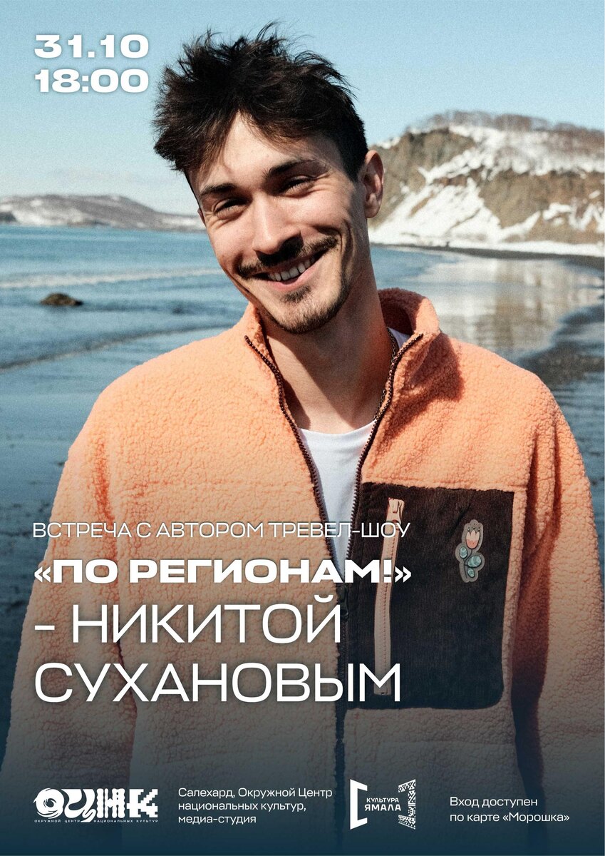 31 октября в 18:00 в Окружном Центре национальных культур состоится встреча с тревел-блогером и автором шоу «По регионам!» - Никитой Сухановым.