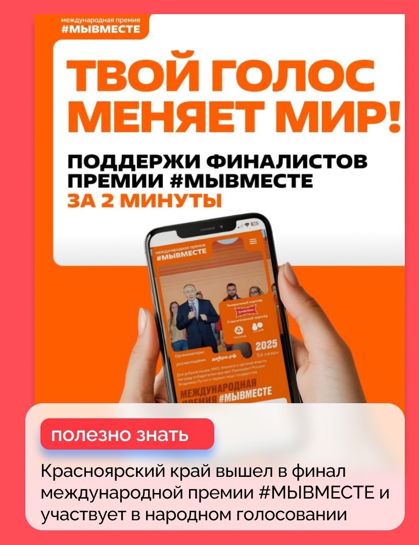 До 7 ноября идёт голосование за финалистов Международной премии #МЫВМЕСТЕ. Жители Красноярского края могут поддержать участников региона и помочь им получить специальную награду «Народное признание».
