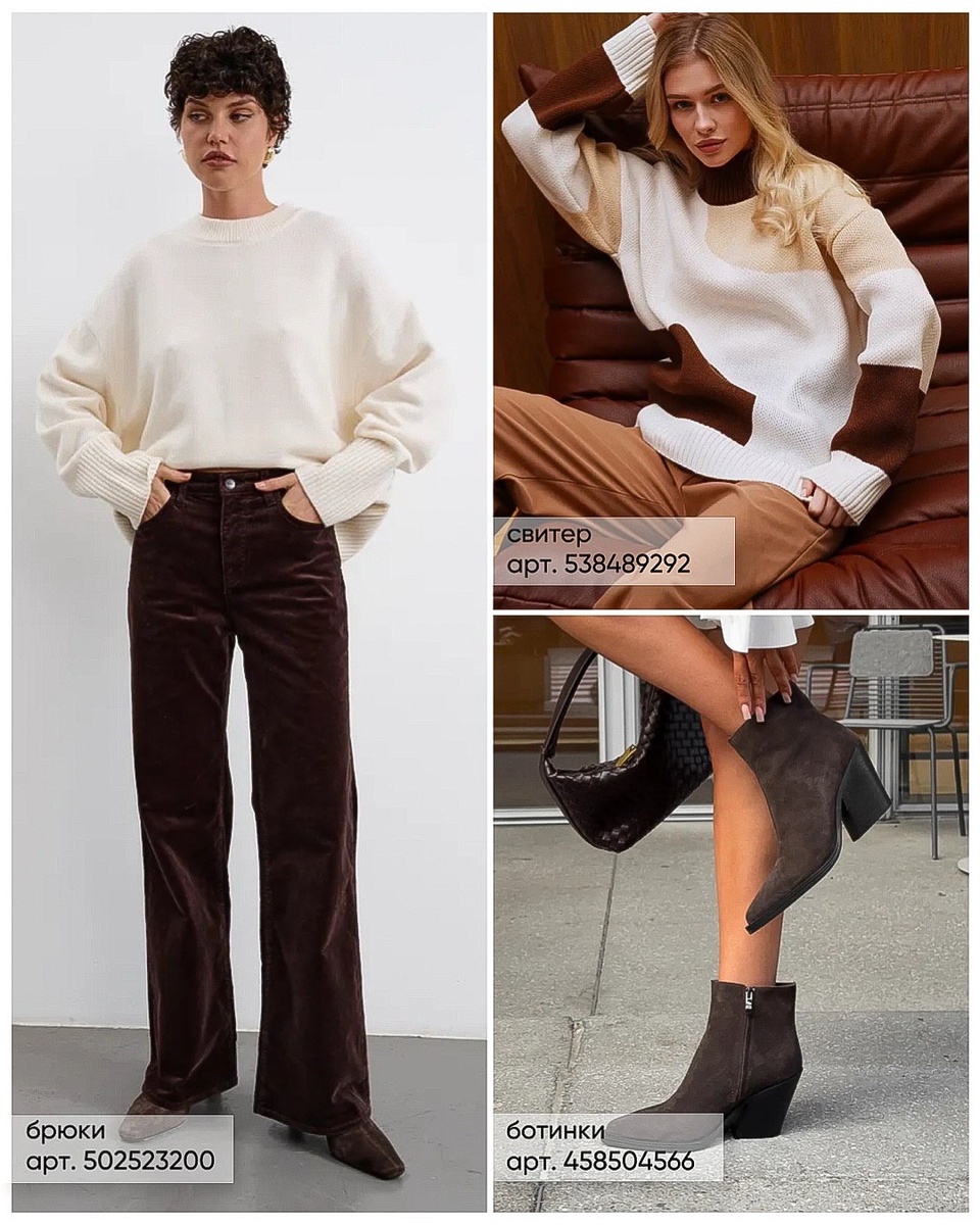Три коллажа — как три настроения осени: тёплая карамель, густой шоколад и воздушные сливки. В каждой подборке — вещи, которые легко сочетаются друг с другом и создают законченные образы без лишней суеты. Ниже — подробный разбор строго по порядку, как на фото, с артикулами и советами стилиста.