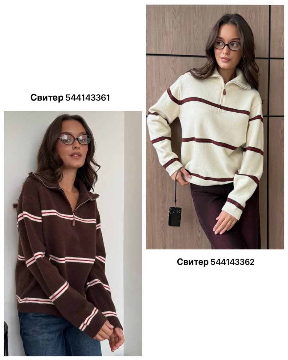 Что это: светлый собрат первого — сливочный свитер с ягодно-шоколадными полосами и тем же воротником-поло на молнии.