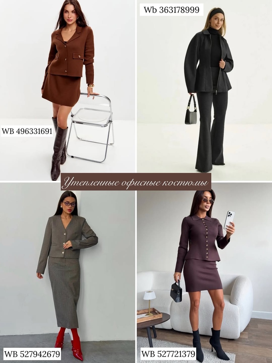 Эта подборка — про разумный шик холодного сезона: тёплые костюмы с юбками, интеллигентные жакеты, уютный трикотаж и верхняя одежда, которая держит форму и температуру. Я разобрала каждый комплект строго по порядку, как на фото, добавила советы по посадке, сочетаниям и уходу. Сохраняйте себе и собирайте капсулу — всё между собой сочетается по цвету и фактурам.