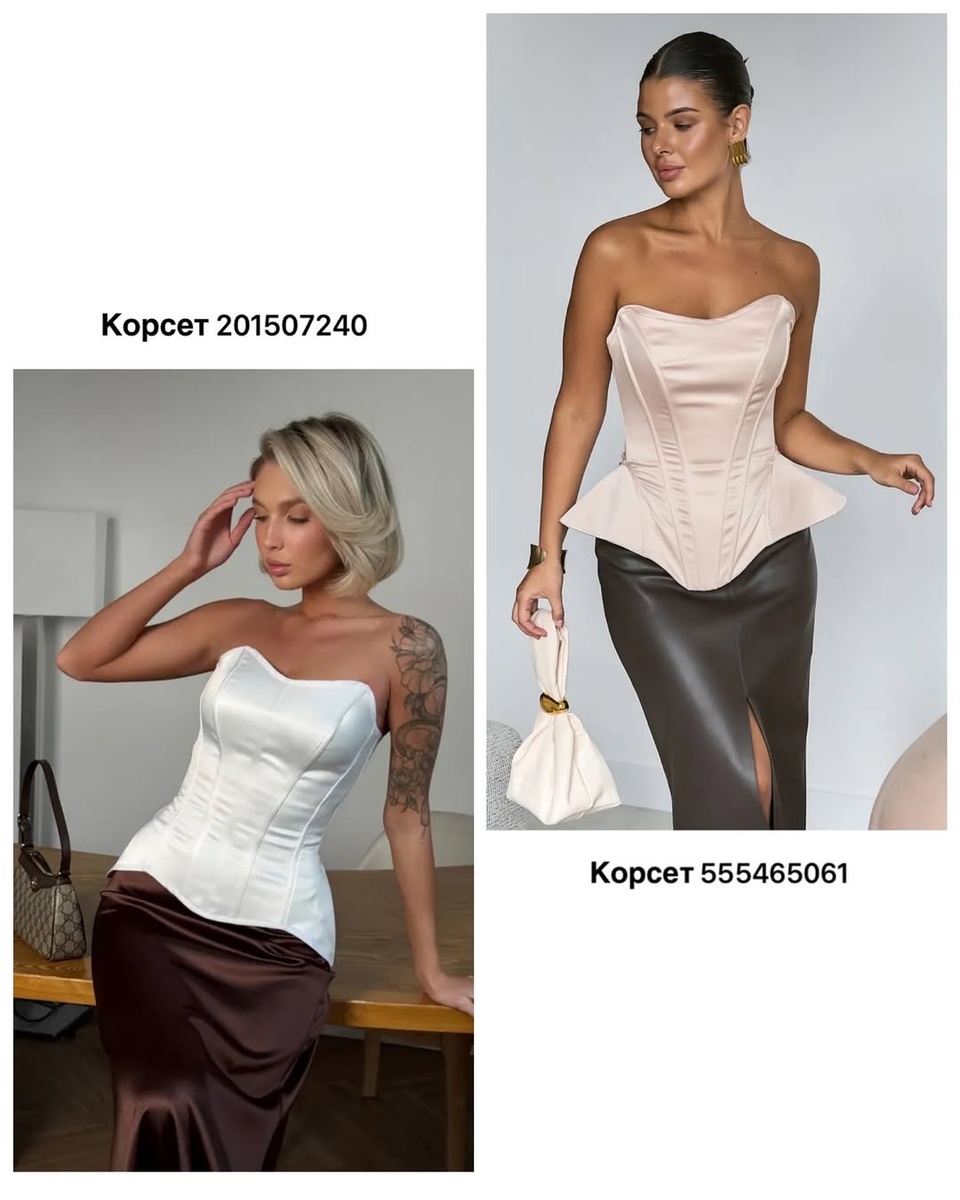 Иногда достаточно пары «правильных» вещей, чтобы любой выход превратился в событие. На коллажах — коллекция, где каждая деталь работает на фигуру: корсеты, подчёркивающие талию, изящное платье, архитектурный пиджак и эффектные верхи для особых случаев. Разбираем всё строго по порядку, как на фото, с артикулами и советами стилиста.