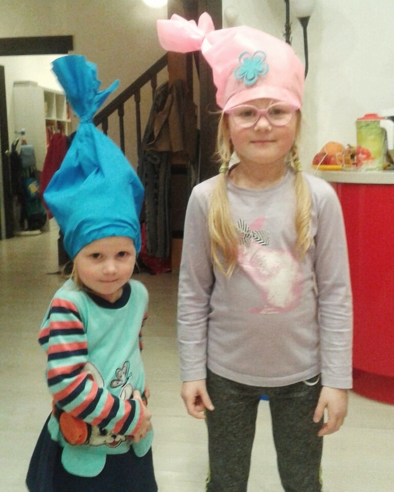 Что такое Троллеуин? Да нет такого слова, мы сами его придумали в 2017 году, когда мои дети обожали мультик «Тролли» и всё с ним связанное. Тогда я решила устроить тематический праздник 31 октября, тем более, что дети болели и к нам бы никто не пришёл. Поле было 6 лет, Еве – 3 года. Мы сами раскрасили тыквы и бутылки-подсвечники, из длинных тыкв сделали Цветана и Розочку, а из консервных банок и цветной бумаги – других троллей. Изготовили флажки – подписали и обклеили наклейками с Троллями, раскрасили плакаты на стену. Обклеили синтепухом картонную основу – получился Мистер Облачко. Подготовка заняла у нас несколько дней, было очень интересно! В сам праздник пекли печенье, надели любимые бумажные «волосы» и смотрели мультик Тролли. Конечно, танцевали под все-все песни (перематывали не по разу)). Был даже квест с призами – чупачупсовыми мини-троллями. Я нарезала цветную упаковку от цветов на квадратики, в центре каждого прорезала дырочку и вставила чупик. Обвязала ленточкой и приклеила