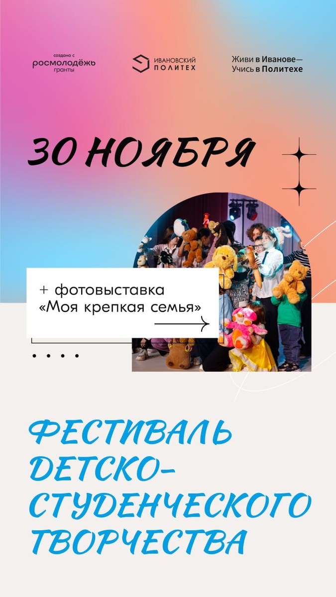 Фестиваль детско-студенческого творчества приуроченный к празднованию «Дня матери» Вы можете принять участие в двух активностях: 🔹Приглашает детей студентов и сотрудников ИВГПУ к участию в Фестивале детско-студенческого творчества. Если ваш ребёнок поёт, танцует, читает стихи, играет на музыкальных инструментах или мечтает стать моделью — это его шанс выступить на сцене, поздравить маму с праздником и получить памятный подарок за участие! 🔹Приглашаем студентов Ивановского Политеха стать участниками фотовыставки на тему «Моя крепкая семья». Поделитесь вашими семейными фотографиями на которых запечатлены самые яркие и запоминающиеся моменты. 🗓 Фотовыставка и фестиваль будет проходить 30 ноября в «День матери» 👉Регистрация на участие в фотовыставке и в фестивале Проект «Твоя семья» реализуется при грантовой поддержке Федерального агентства по делам молодёжи — Росмолодёжь. #РосмолодёжьГранты #Росмолодёжь #ПолитехТвояСемья #ЖививИванове_УчисьвПолитехе