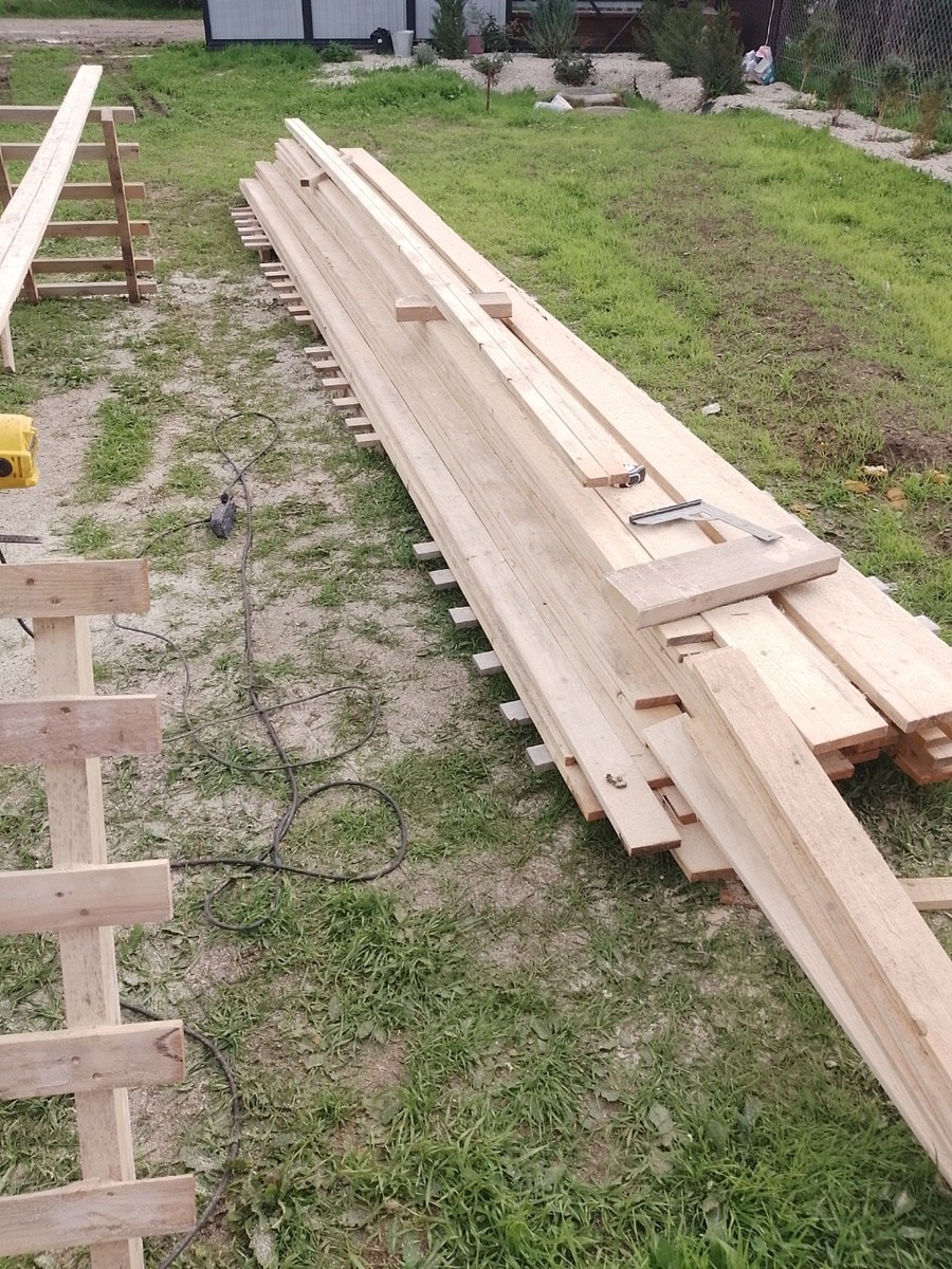 Здравствуйте! Понедельник у нас получился день, бездельник. Периодически весь день с неба шел полив нашего нового, только посаженного газона, так что месить грязь на объекте не было никакого смысла. Зато на следующий день пришлось наверстывать. Пиломатериал теперь берем прям здесь у нас, на Парусе. Базе в Феодосии не повезло, не работают, здесь дороже, но удобнее. Приехали, оплатили, через полчаса доски у нас, можно работать. Обрешетку обрабатывать не стали. Она чистая, считай сухая, а под крышей вообще высохнет до звенящего состояния. Здесь нет такой высоты крыши, как на доме из бревна, один ярус лесов и спокойно можно делать лобовую доску, водосточную систему, ну и собственно пару досок обрешетки можно приколотить с лесов. Вообще кровля, точнее чердак не планировалось использовать как жилое пространство, так что можно было купить самую дешевую, универсальную, похожую на мешковину, гидроизоляцию, работа у ней была бы просто как антиконденсатная система, ну и может какие то капли