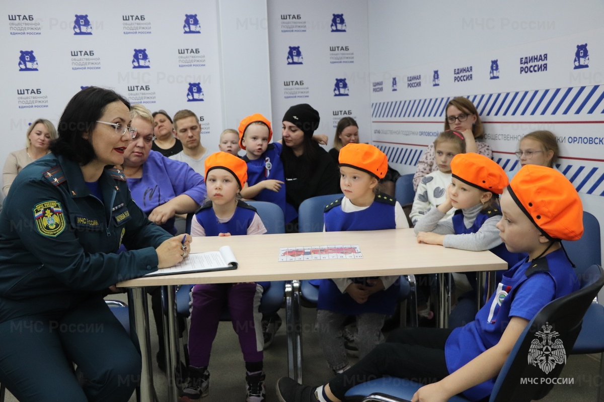 Штаб общественной поддержки Орловской области в очередной раз стал местом встречи всех, кому небезразлична тема безопасности, от мала до велика. Среди воспитанников кадетских отрядов детских садов города Орла впервые состоялась интеллектуальная викторина, где необходимо было показать, как они знают правила поведения в экстремальных ситуациях и особенности работы пожарных и спасателей. Она была построена в формате игры, ведь именно так маленьким жителям региона проще всего усваивать азы безопасности. Для ребят из детских садов №1, 47, 79 и 96 города Орла это было знаменательное и волнительное событие, своеобразная проверка знаний – всего того, чему они учатся, участвуя в работе своих отрядов. Ответственно к нему отнеслись и педагоги образовательных учреждений, стараясь подготовить ребят к самым сложным вопросам и заданиям. Итак, отряды «Орлята», «Звездный десант», «Спасарки» заняли места за столами и приготовились блеснуть своими знаниями. Ведущей стала начальник пресс-службы Главного у