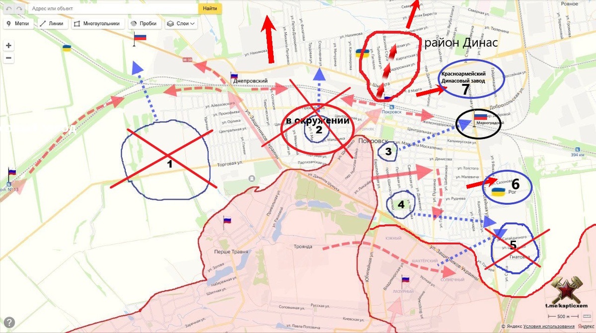 ВС РФ забрали и последний в городе , очень важный жд переезд на Мирноград (черный круг), тем самым котлы №3 и 4 полностью захлопнуты физически, а №7 и 6 изолированы друг от друга.