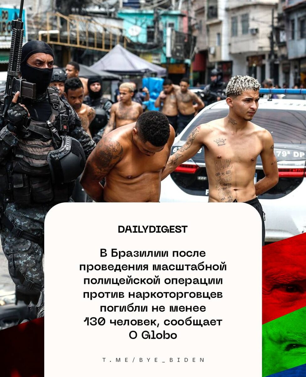 ☑️ Главные новости на утро 30 октября: 🔹В Бразилии после проведения масштабной полицейской операции против наркоторговцев погибли не менее 130 человек, сообщает O Globo. 🔹Трамп заявил, что поручил Пентагону немедленно начать испытания ядерного оружия. 🔹Венесуэла раскрыла подготовку провокации ЦРУ в Карибском море, заявил Мадуро. 🔹Переговорщики Китая и США достигли базового консенсуса по решению основных проблем и добились обнадеживающего прогресса, заявил Си Цзиньпин. 🔹Трамп назвал замечательной встречу с Си Цзиньпином, по его словам, на ней было принято очень много важных решений. 🔹Трамп заявил, что снизил вдвое — до 10% — пошлины на импорт из Китая, введенные из-за контрабанды фентанила. 👍 БайБайден. Подписаться