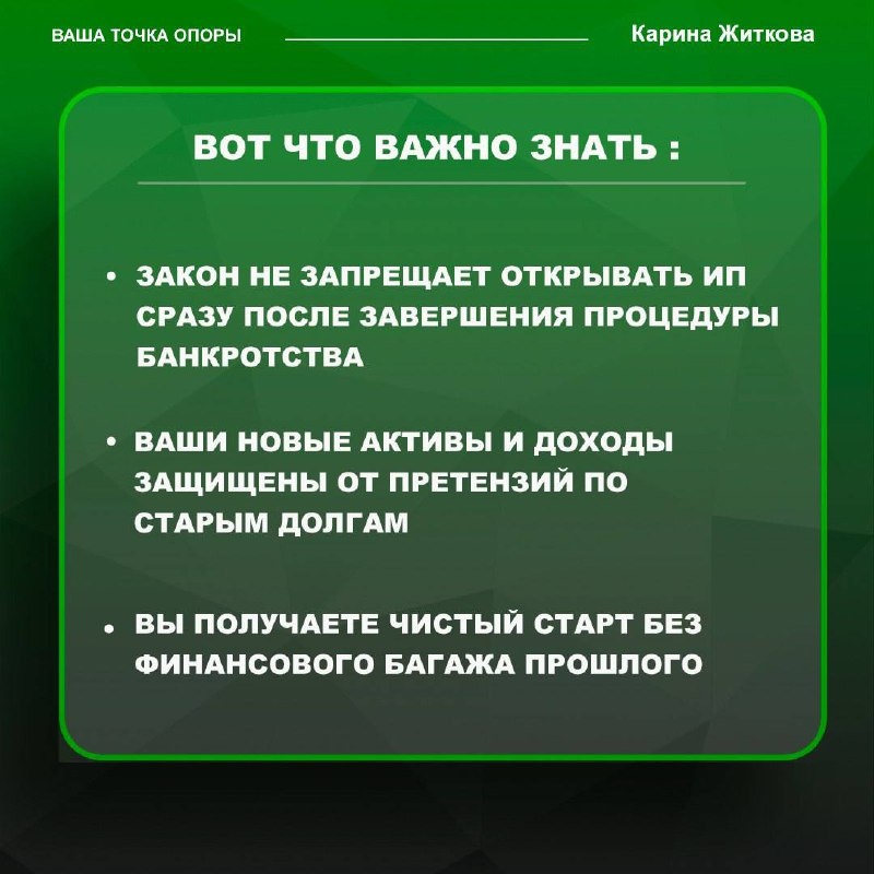🔥 БАНКРОТ И БИЗНЕСМЕН: КАК ОТКРЫТЬ СВОЁ ДЕЛО СРАЗУ ПОСЛЕ БАНКРОТСТВА (И ПОЧЕМУ ЭТО РАБОТАЕТ!) "Банкротство — это конец бизнес-карьеры" — один из самых опасных мифов, который мешает людям начать новую жизнь. Представьте: вчера вы были в долгах, а сегодня открываете собственное ИП без страха, что прошлые кредиторы предъявят свои требования. Звучит как мечта? Нет — это реальность, доступная каждому! История нашей клиентки Марины показательна: после банкротства она открыла небольшую кондитерскую, и через год её ежемесячный доход превысил 300 000 рублей. "Я наконец-то занимаюсь любимым делом без страха, что придут приставы", — делится она. Но важно помнить: самостоятельное прохождение процедуры банкротства может таить подводные камни, способные помешать вашему будущему бизнесу. Именно поэтому так важно заручиться поддержкой опытных специалистов. Хотите узнать, как правильно пройти процедуру банкротства и открыть свое дело? Запишитесь на бесплатную консультацию — мы расскажем, как сд