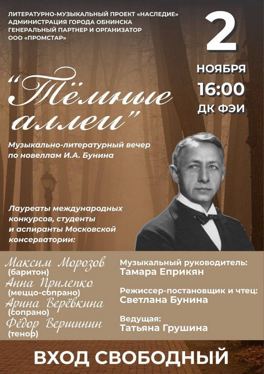 2 ноября в ДК ФЭИ пройдёт музыкально-литературный вечер «Тёмные аллеи» по новеллам И.А. Бунина, посвящённый 155-летию со дня его рождения.