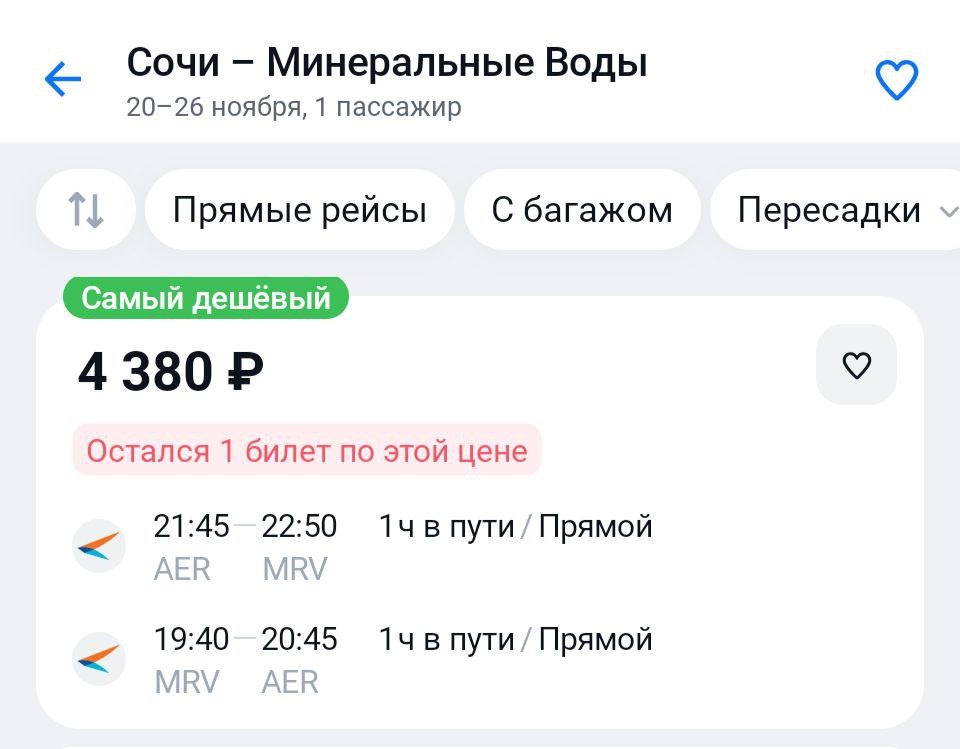 Вдогонку к этому посту. "Чё делать в этих ваших Сочах в ноябре?" Ну, окей, смотрим. 📍Сочи - МинВоды - 4400₽ ↔️ https://aviasales.tpm.lv/Q7q1l6fs 📍Сочи - Ереван - 7900₽ ↔️ https://aviasales.tpm.lv/v4GgbdbT 📍Сочи - Стамбул - 12000₽ ↔️ https://aviasales.tpm.lv/Re5Nmlmn 📍Сочи - Анталья - 3500₽ ➡️ с багажом! https://aviasales.tpm.lv/rBDk7BHj 📍Сочи - Батуми - 9400₽ ↔️ https://aviasales.tpm.lv/4JXwPmSs Ну и тд.) #AER @KJA