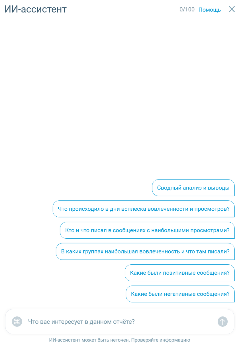 В «Медиалогии SM» появился ИИ-помощник, который анализирует данные соцсетей и онлайн-СМИ по запросу в чате с пользователем системы. ИИ-ассистент «Медиалогии SM» работает с любым отчётом и в любом ракурсе в рамках сервиса. Что умеет ИИ-ассистент В «Медиалогии SM» ИИ-ассистент анализирует данные по определенной теме за любой период в рамках отчета, а также количественные и качественные параметры сообщений, проводит прицельный поиск данных внутри отчёта, придумывает ключевые слова для выполнения поставленной задачи и строит ответ на вопрос пользователя, опираясь на все метрики «Медиалогии SM» одновременно. Теперь в отчете достаточно сформулировать прямой запрос, чтобы ИИ-помощник подтянул все загруженные данные и выдал подробный ответ — со ссылками на подходящий аналитический ракурс, примерами публикаций, оценкой реакции аудитории и саммари по теме обращения. Сценарии работы Для быстрой адаптации и удобства пользователей при работе с ИИ-ассистентом можно выбрать так называемые conversatio