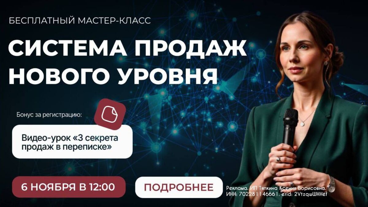 Хаос в продажах? Пора выстроить систему, которая работает без тебя Как типичный предприниматель на старте, я завязала на себе много процессов. В том числе и продажи! В какой-то момент поняла, что если хочу реальный бизнес, а не самозанятость — надо строить систему в которой отдел продаж стабильно приносит х2, каждая заявка доходит до сделки, а я наконец занимаюсь развитием бизнеса. В прошлом году я училась у Ксюши, и мы оцифровали и автоматизировали 80% задач по продажам, которые помогают команде расти без хаоса и перегрузок. Если вы хотите по шагам увидеть, как выстроить систему продаж в своём проекте, то обязательно приходите на мастер-класс и постройте чёткиий план ⬇️ 📅 06 ноября, 12:00 (мск) «Система продаж нового уровня» Бесплатный мастер-класс от эксперта по продажам и учредителя IT-компании Ксении Тяпкиной За 1,5 часа вы поймёте, как с помощью нейросетей выстроить отдел продаж, который работает без вас, масштабирует выручку и превращает хаос в предсказуемую машину роста.