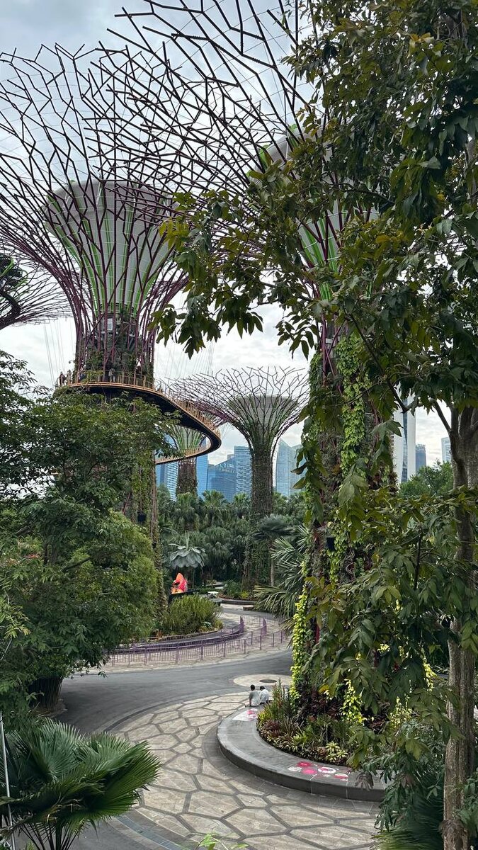 Это, пожалуй, самая узнаваемая достопримечательность города — парк будущего, где природа и технологии соединились буквально в одном кадре. Главные звёзды парка — это, конечно, супердеревья (Supertrees) 🌳 Они не настоящие, но при этом живые: металлические конструкции высотой до 50 метров служат вертикальными садами, на которых растут сотни видов растений. Днём они собирают солнечную энергию, а ночью превращаются в фантастическое световое шоу. Я была там в середине сентября и застала необычную выставку — рядом с деревьями стояли сотни ярких медведей, символизирующих разные страны мира 🐻 Это Buddy Bears — международная выставка, идея которой в том, что все страны стоят рядом, “рука об руку”, как символ дружбы и мира. Каждый мишка расписан художником из своей страны, отражая её культуру и характер. В парке есть знаменитый мост OCBC Skyway — пешеходная дорожка, соединяющая несколько супердеревьев на высоте около 22 метров Самое волшебное начинается вечером ✨ Каждый день в 19:45 и 20:45 п