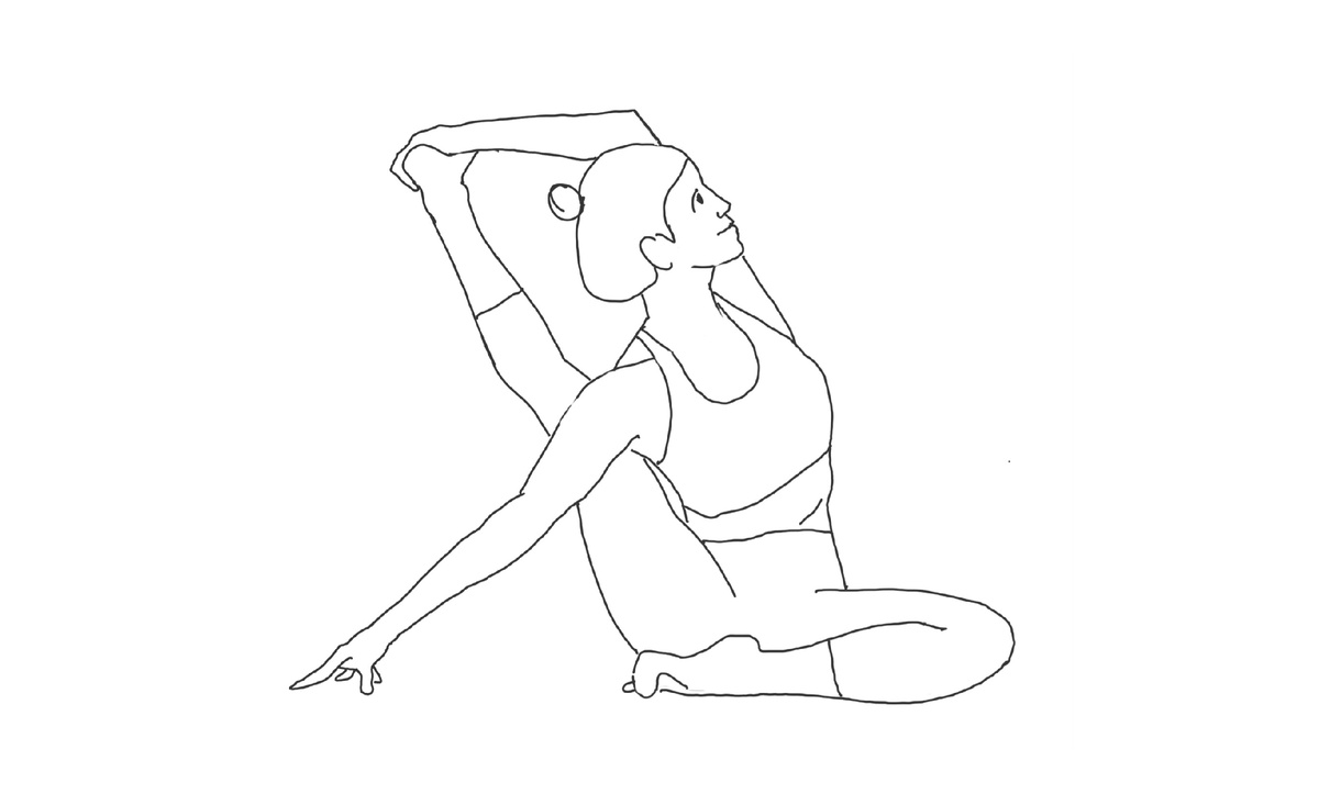 - Уттхита Триконасане (противоход) - Уттхита Паршвоконасане (противоход) - Паршва Свастикасане - Паршва Урдхва Баддха Ангулиасане скручивание позвоночника