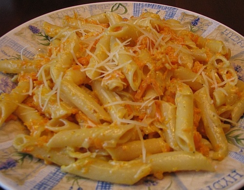 ПРИГОТОВЛЕНИЕ: Как и во многих рецептах пасты с соусом, готовить и то, и другое нужно параллельно, чтобы к моменту готовности соуса паста была готова и горячей. Пасту очень желательно не переварить, чтобы она ни в коем случае не была мягко-разварено-разваленной. Обычно рекомендуется варить чуть меньше времени, указанного на упаковке. Для соуса мелко порежьте лук и обжарьте в оливковом масле до прозрачности и мягкости. Лук не должен зажариться — изменить цвет. Тыкву очистите и нарежьте на терке для корейской моркови, т.е. тонкой соломкой, но если вам по душе пастообразные соусы, то можно и на терке. Выложите