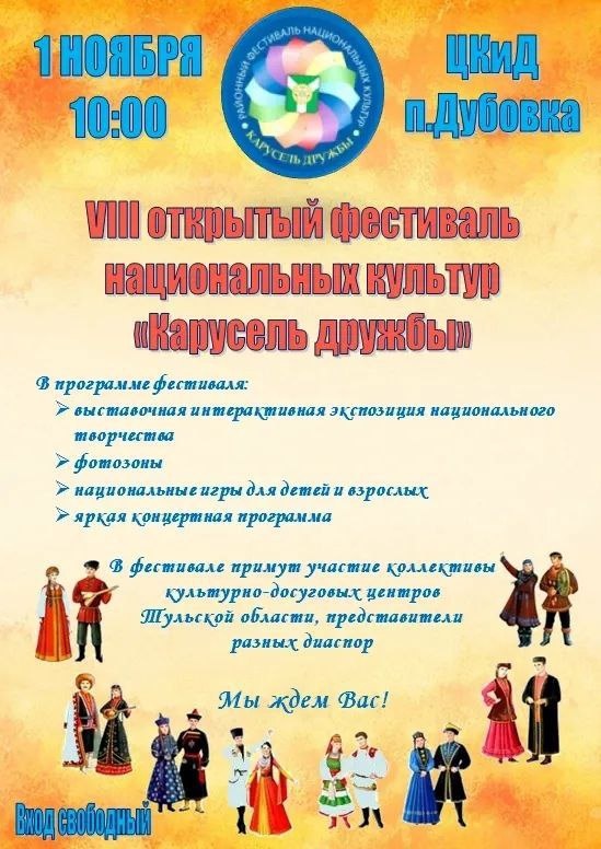 🇷🇺В преддверии Дня народного единства в посёлке Дубовка пройдет районный фестиваль национальных культур «Карусель дружбы». Это масштабное событие объединит представителей разных народов, чтобы показать богатство и разнообразие культур нашей страны.