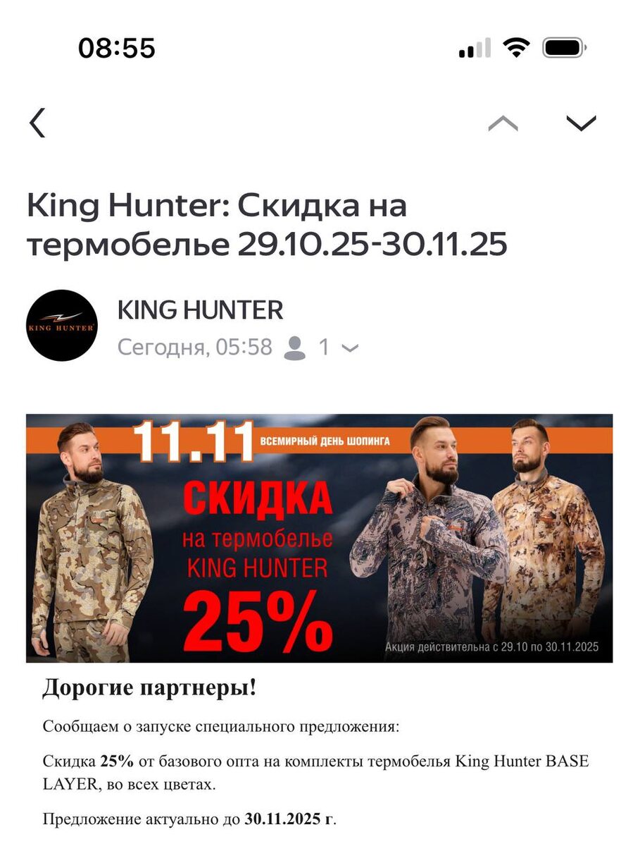 Ну, вот. Кто давно хотел свой костюм полностью и в цвет дополнить бельем Кинг Хантер, сейчас самое время. Нате вам, пожалуйста. Теперь скидка 25% и на остальные размеры, где не проставлена больше ( какие то уже были размеры со скидкой 30%). Там где цена сейчас 19660, теперь она будет посчитана как 14700. Размеры тают на главном складе. У нас не много осталось. Поэтому лучше напишите Ане в ватсап. Она посмотрит и наш склад и файл с главного и решит откуда отправить. +7 951 106-32-49- Аня. https://royal-camo.ru/product-category/thermal-underwear/king-hunter-thermal-underwear/
