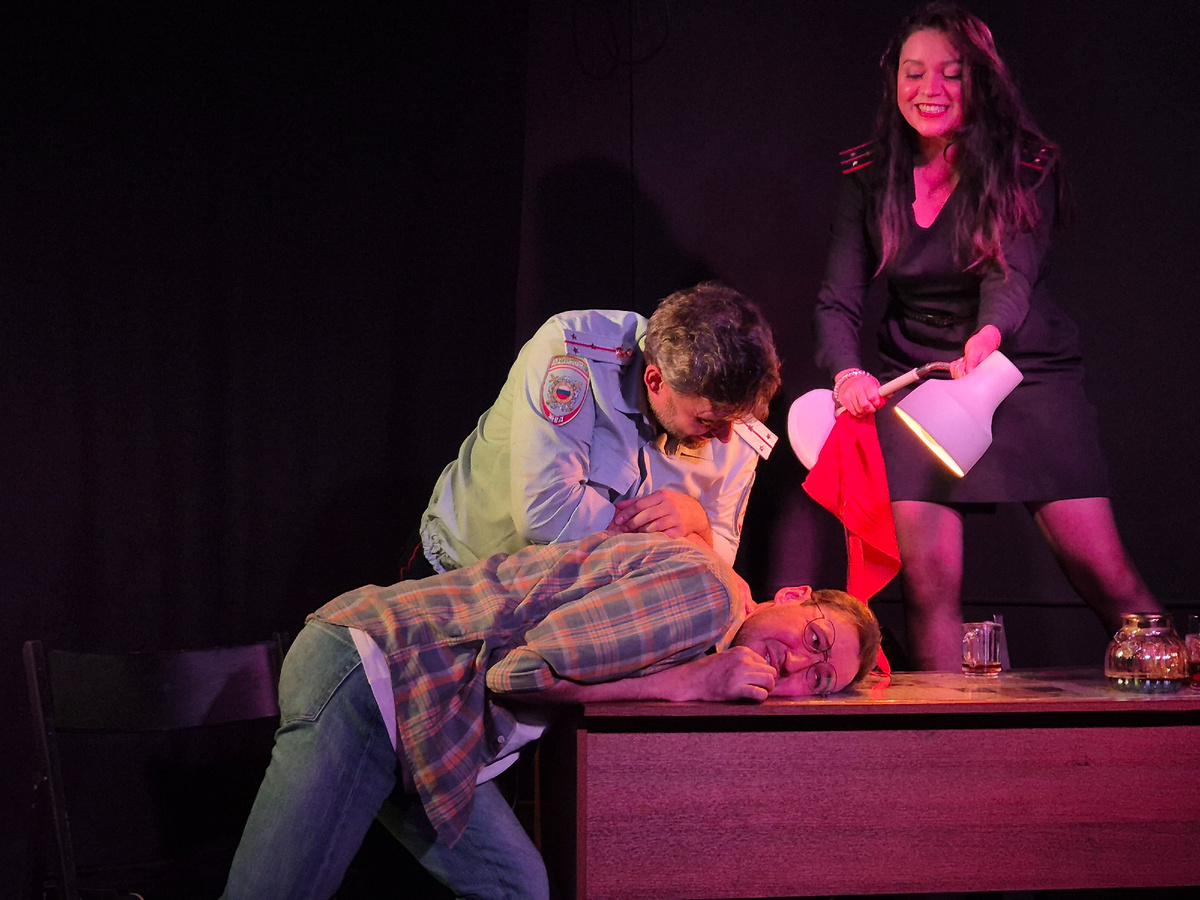 Но абсурдная ситуация в участке, куда он попал, раскрашивает его серый мир самыми неожиданными красками. И делают это потрясающие актеры. Полицейский (Алексей Нечепуренко), он не просто ведет допрос, у него невероятно красивый, бархатный голос, который может утешать, дразнить и даже петь песни. Его напарница, Госпожа Капитан (Ксения Бевзова), роскошная, иногда милая, порой жестокая, но в ее скепсисе сквозит своя правда. Полицейские пытаются заставить героя «разуть глаза», научиться видеть удивительное в обыденном и смотреть на свой Подольск так, как смотрят на Париж или Амстердам. А Сережа (Евгений Бадамшин) - это просто взрыв харизмы, задора и иронии! Придал особенную изюминку всему спектаклю. Смеялись от души!