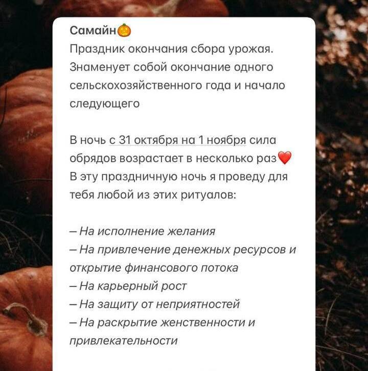 САМАЙН 31 октября буду проводить ритуал Самайн 👻 дополнительно : 🕯Чистка от негатива 🕯Работа с рунами 🕯️Открытие дорог Приглашаю всех желающих участвовать в данном ритуале 🪐 Будет страшно интересно🐱 Начало в 20:00 Мест все меньше , большую часть заняли 🙌🏻 стоимость одного ритуала : 2.500₽ Пишите !