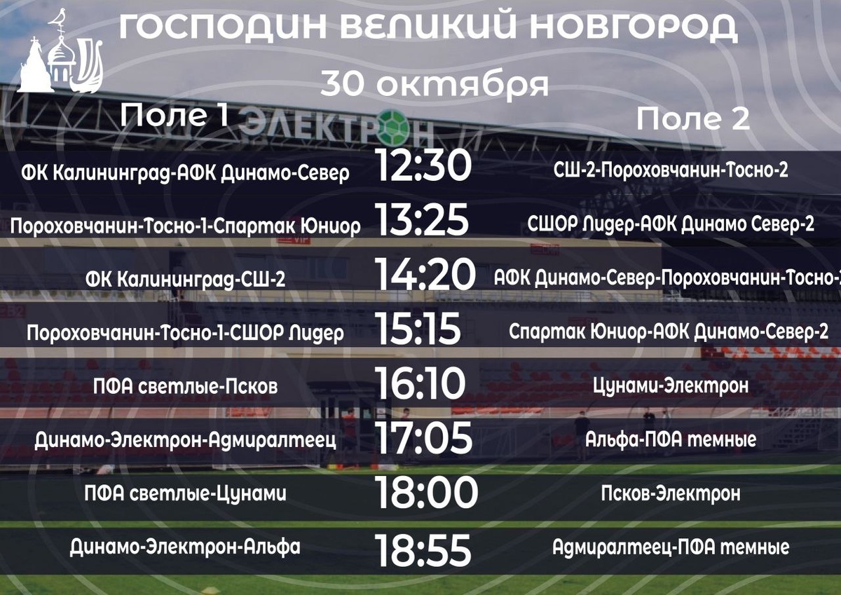 📆 День тренера отмечается сегодня, друзья, поздравляем всех причастных к этому празднику, желаю вам всего самого наилучшего и самое главное, чтобы нас спортсмены радовали на новые победы. ⚽️🏆Турнир «Господин Великий Новгород» среди 2014 года рождения 🎉 Бёрт свой старт, уже с ⏰12:30 на стадионе «Электрон» начнутся матчи, следить за ходом игр вы можете смотреть в нашем сообществе 👇 С первого поля 💻 vkvideo.ru/video-223836026_4562... С второго поля 📹 vkvideo.ru/video-223836026_4562... Желаем всем удачи.